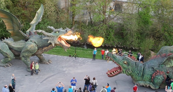 11 Tonnen schwer, 15 Meter lang, sie kann lächeln, die Zähne fletschen und richtig gehen! Feuer speien können beide Ungeheuer.