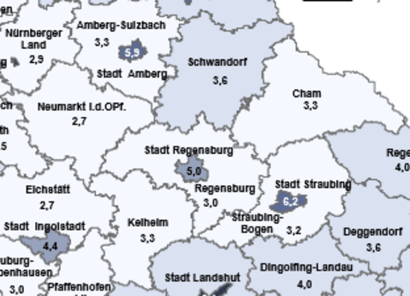 Die Arbeitslosenquote in der Oberpfalz liegt im April bei 3,7 Prozent und somit unter dem bayerischen Schnitt (4,0 Prozent). Die niedrigste Arbeitslosenquote in der Oberpfalz verzeichnet erneut der Landkreis Neumarkt mit 2, 7 Prozent. Die höchste Quote hat erneut die Stadt Weiden mit 6,3 Prozent. In der Stadt Regensburg waren es genau 5 Prozent, im Landkreis Regensburg 3, im Landkreis Cham 3,3 und im Landkreis Schwandorf 3,6 Prozent.