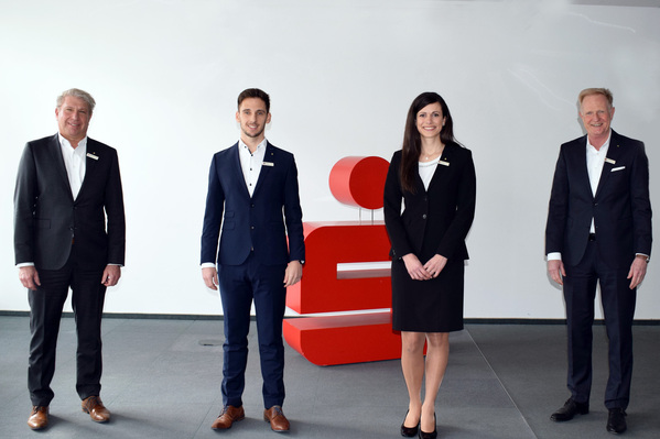 Auf dem Foto: Filialbereichsleiter Süd der Sparkasse Regensburg, Christian Bock, und der stellvertretende Vorstandsvorsitzende, Dr. Markus Witt, begrüßen die neuen Filialleiter Daniel Kursawe und Christina Brandl (Mitte). © Carolin Winkelmeier/Sparkasse Regensburg
