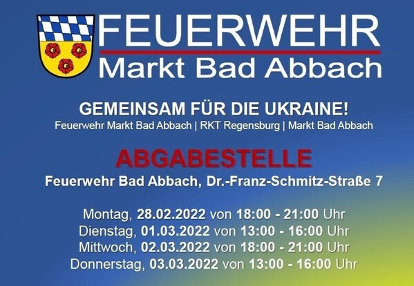 Die Menschen in der Ukraine, sie brauchen jetzt unsere Hilfe! Das hat sich auch die Feuerwehr in Bad Abbach gedacht und gemeinsam mit dem Markt und dem RKT Rettungsdienst die Aktion „Gemeinsam für die Ukraine“ gestartet. Sie dürfen Kartons packen, mit alltäglich Dingen, die die Menschen dort gerade dringend brauchen, z.B. Windeln, Konserven oder Decken. Eine genaue Liste finden Sie auf der Facebookseite der Feuerwehr Bad Abbach. Abgeben können Sie ihr Paket noch heute Abend oder morgen Nachmittag bei der Feuerwehr.