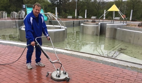 Verantwortlich dafür ist Schwimmmeister Jürgen Jänke. Gemeinsam mit seinen Kollegen macht er den Außenbereich des Westbads bis zum Saisonstart am 01. Mai fertig. Zuerst muss der Bodenbelag mit Hilfe von Bürsten und Dampfstrahlern vom Schmutz befreit werden. Dann kommen die Becken dran. Sie werden ab nächster Woche befüllt. Bis das große Springerbecken voll ist dauert es vier ganze Tage.