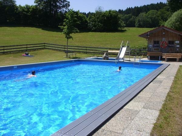 In Kollnburg im niederbayerischen Landkreis Regen ist das so. Aber hier weiß man sich auf kreative Art zu helfen. In dem Ortsteil Einweging, in dem gerade mal 40 Einwohner leben, hat man sich einfach selbst ein Freibad gebaut! Und zwar mit allem Drum und Dran! Mit Sprungbrett, Wasserrutsche und Wasseraufbereitungsanlage. Das Schwimmbecken ist 16 Meter lang und 8 Meter breit. Eigentlich war es früher ein Löschwasserbecken für die Feuerwehr, dann hat sich der Förderverein Bad Einweging gegründet. Alle haben zusammen geholfen um aus den Löschwasserbecken ein Freibad zumachen.