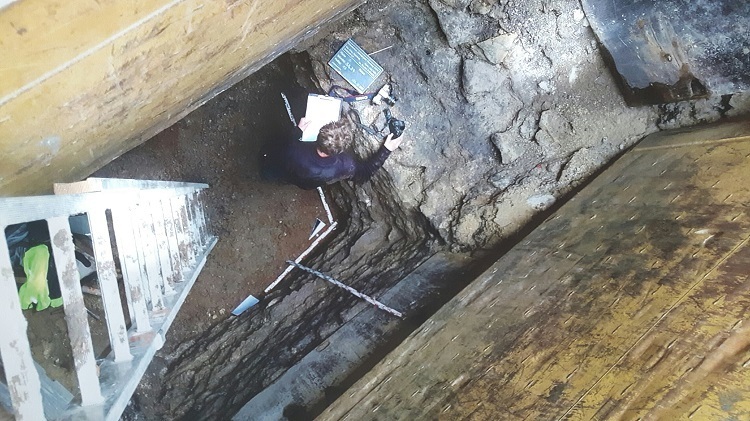 Dokumentation bei den Grabungsarbeiten in sechs Meter Tiefe. In der Viereimergasse entdeckte man einen gut erhaltenen Rest eines Kellers mit Treppenabgang, wohl aus dem späten Mittelalter. Foto: Amt f. Denkmalschutz