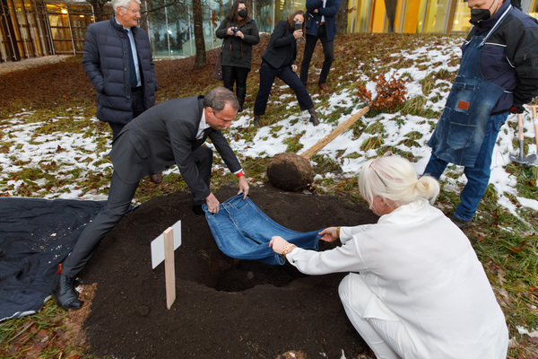 Beim Besuch des Ministers wurde eine Rotbuche gepflanzt, das besondere dabei: Unter die Wurzeln des Baumes wurde die erste kompostierbare MAC-Hose gelegt.