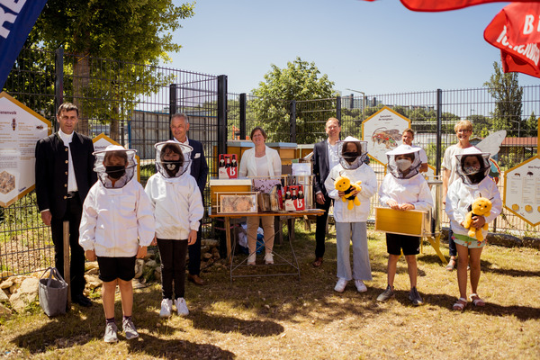 Bild: Domkapitular Thomas Pinzer, Bürgermeister Ludwig Artinger, Bischofshof-Geschäftsführerin Susanne Horn, REWAG-Vorstandsvorsitzender Dr. Torsten Briegel, Imker Sven Ticks und Kreuzschul-Rektorin Beate Müller