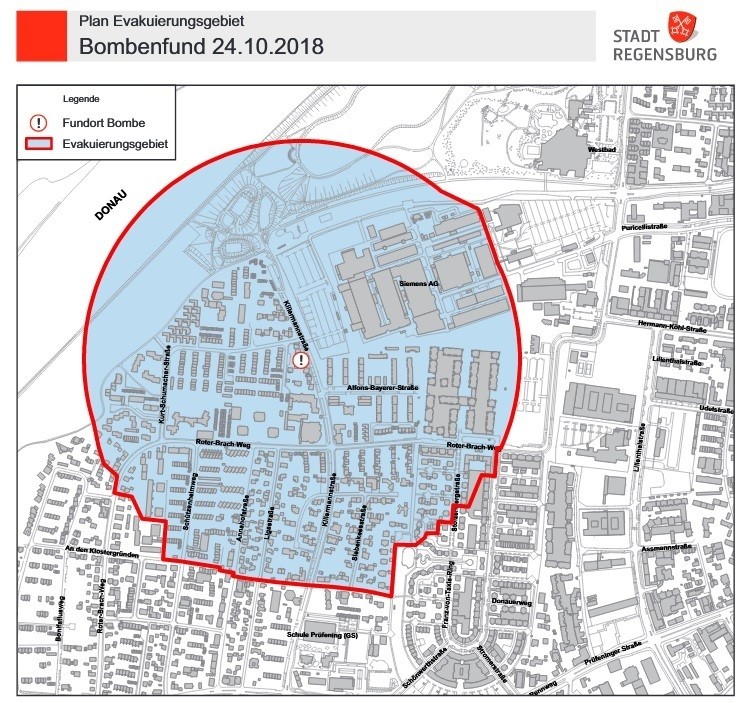 Der Bomben-Fundort wird rund um die Uhr abgesichert und bewacht. Wer Fragen hat oder Leute die Hilfe benötigen ihre Häuser oder Wohnungen zu verlassen sollen sich beim Bürgertelefon der Stadt melden. Das wird ab heute (Mittwoch 24.10.) 11 Uhr bis morgen Nachmittag unter der Nummer 0941 / 507 2326 eingerichtet. Genauere Anweisungen und Informationen zu den Sammelstallen bzw. Aufenthaltsmöglichkeiten während der Entschärfung werden heute im Laufe des Tages von der Stadt bekannt gegeben.