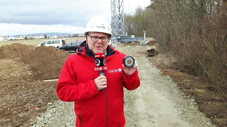 charivari-Reporter Robert Huber bei seiner Reportage auf der Baustelle nahe der Herbert-Quandt-Allee. In der linken Hand ein durchgeschnittenes 110 KV-Stromkabel.