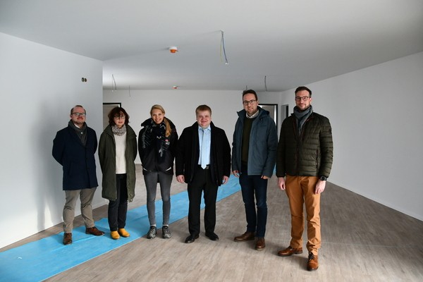 Foto: Die Arbeiten befinden sich in der Endphase: Harald Bruischütz, Leiterin des Bürgertreffs Tina Kolb, Bauleitung der Firma Ehrenreich Elisa Feicht, Bürgermeister Thomas Gesche, Sozialteam Geschäftsführer Dr. Christian Weiß und Andreas Neugirg freuen sich schon auf die Eröffnung des Servicehauses.