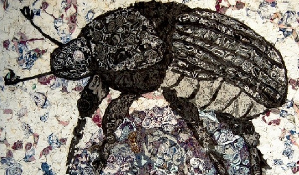 Er zerschneidet für die Kunstwerke unter anderem Socken, Unterhosen und Bettlacken. Ein Stück, dass er erst kürzlich verkauft hat, zeigt einen Mistkäfer auf einer Kotkugel.