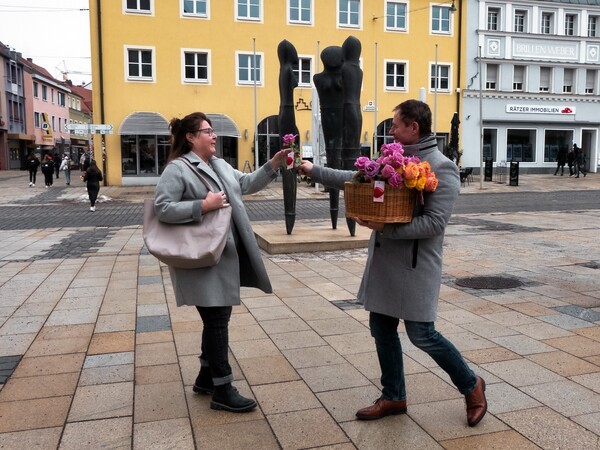 Gleichzeitig hat der Neumarkter Oberbürgermeister Thomas Thumann, unterstützt von Mitarbeiterinnen, zum Valentinstag Rosen an die Passantinnen am Rathaus in Neumarkt verteilt. Schon seit vielen Jahrzehnten hat diese Verteilung von Valentinsgeschenken durch das Neumarkter Stadtoberhaupt eine gute Tradition. Dabei gab es schon die unterschiedlichsten Valentinsgeschenke. Es gab z.B. schon gebackene Herzen aus Krapfenteig, die mit einer Schokoglasur überzogen und mit farbigen Zuckerstreuseln verziert waren. In einem anderen Jahr gab es Herzen aus Laugenteig, aber auch große Plätzchen in Spitzbubenart, kleine Blumengestecke oder wie dieses Jahr Rosen kamen schon zum Einsatz. Mehrere hundert Rosen brachten Oberbürgermeister Thumann und seine Mitarbeiterinnen trotz des nicht so guten Wetters unter die Bevölkerung.