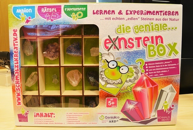 Sie hat eine Lern- und Expermentierbox mit echten Edelsteinen für Kinder entwickelt und auf den Markt gebracht. „Die geniale Einsteinbox“.