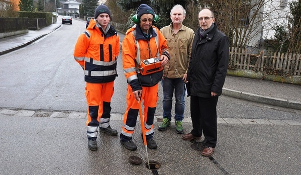 (Bild: Herbert Hofrichter (2.v.li.) ist der „Rohrburch-Fahnder“ der Stadtwerke, hier im Bild mit (v.li.) Tobias Buberger, Johann Reif, Leiter des Wasserwerks, und Stadtwerke-Vorstand Friedrich Gluth)