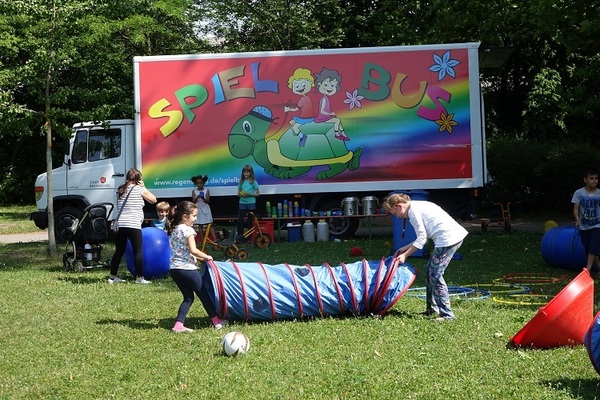 Der Spielbus ist ein LKW voller Spielgeräte, von der Rollenrutsche über Brettspiele zu Pedalos … Immer dabei ist auch das Spielbusteam: Das sind drei bis fünf Erwachsene, die Zeit, nur für euch, haben! Beim Spielbus gibt es Bewegungsspiele, Bastelangebote, Fallschirmspiele, Riesenseilhüpfen, Zirkusspiele und vieles, vieles mehr.