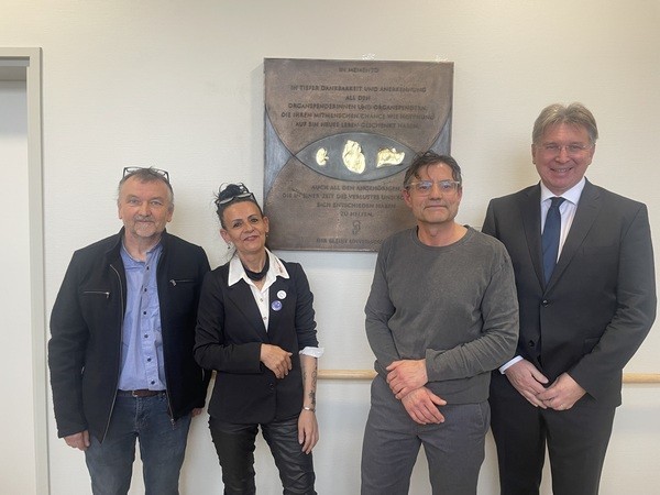 vlnr: Bildhauer Alois Achatz, Angehörige Eva Schmid, Transplantationsbeauftragter des Universitätsklinikums Regensburg Dr. Stephan Schweiger, Leiter Universitäres Transplantationszentrum Regensburg Prof. Dr. Bernhard Banas