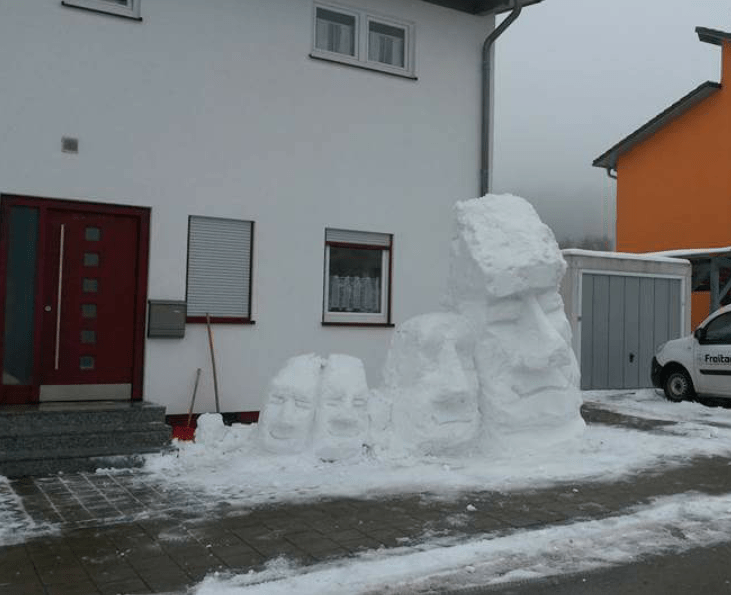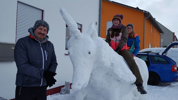 Zuletzt hatte er sich inspirieren lassen von den Moai-Steinstatuen auf den Osterinseln und ein über 4 Meter hohes Exemplar aus Schnee gezaubert. Das ist im allerdings umgekippt. Jetzt hat der Mann ein Einhorn gebastelt. Es war der Wunsch seiner beiden Töchter.
