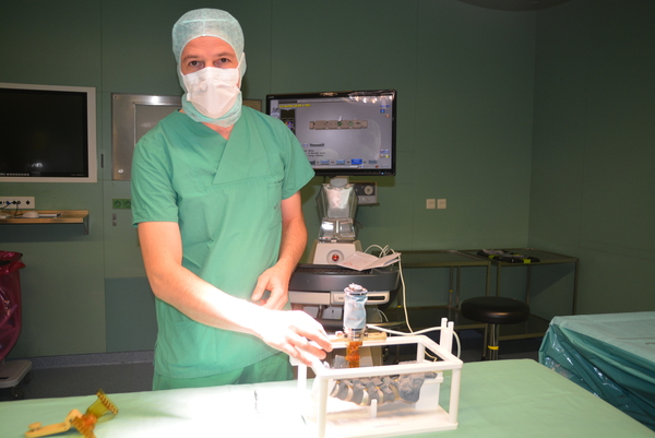Der Roboter auf einem Wirbelsäulen-Modell. Dr. Doenitz führt vor, wie der Roboter den Kanal für die Schraube positioniert.