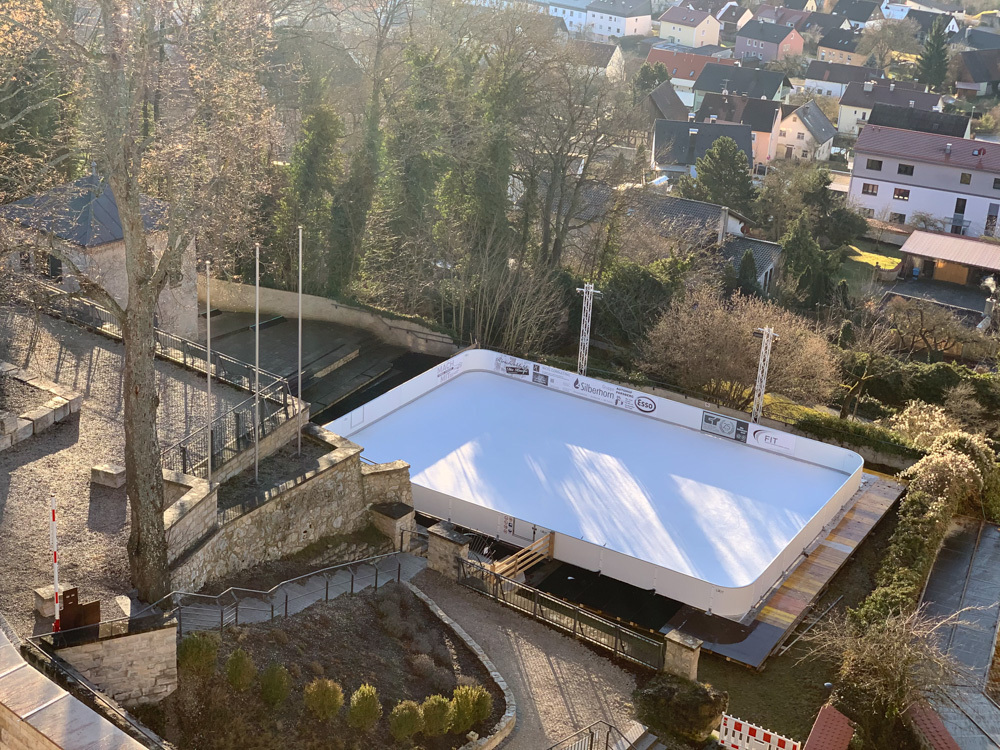 Raus gehen und Schlittschuhlaufen – trotz Corona. In Parsberg im Landkeis Neumarkt hat man das für Kinder bis 14 Jahre möglich gemacht und das auch noch vor einzigartiger Kulisse. Die Eislaufbahn steht oben auf dem Gelände der Parsberger Burg mit herrlichem Panoramablick. Sie ist kostenlos und ab sofort wieder den ganzen Tag frei zugänglich, sogar abends bis 21 Uhr mit entsprechender Beleuchtung. Die Stadt hat zusammen mit dem Gesundheitsamt ein Hygienekonzept entwickelt, entsprechende Hinweisschilder sind vor Ort zu finden. Es dürfen maximal 10 Kinder gleichzeitig auf die Eisfläche, in Begleitung eines Erwachsenen, damit die Eltern eigenverantwortlich sicher stellen können, dass die Masken getragen und der nötige Abstand eingehalten wird. Einen Verleih oder ähnliches vor Ort gibt es nicht. Das gute an der Bahn: sie ist aus Kunststoff und so bei jedem Wetter befahrbar.