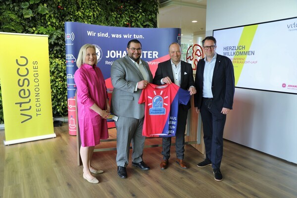 Bild: Claudia Fritsch (Vertrieb Johanniter), Tobias Karl (Regionalvorstand Johanniter) André Kühnle (Leiter des Vitesco Technologies und Matthias Walk (Pressesprecher Johanniter) präsentieren das Johanniter-Laufshirt.
