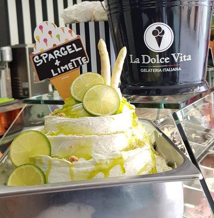 Und im Eiscafe von Lucia Notinelli in der Abensberger Innenstadt gibt es Spargeleis, verfeinert mit Granatapfel und heuer neu: Mit Limette.