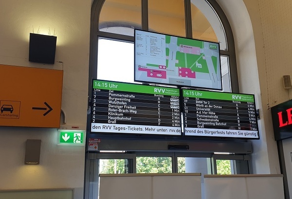 Drei neue Displays in der Eingangshalle informieren insbesondere über die nächsten Abfahrtszeiten der Busse in Echtzeit, die räumliche Anordnung der Bussteige sowie über weiterführende RVV-Angebote.