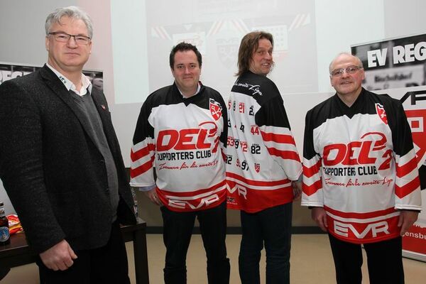 Der Eishockey-Oberligist EV Regensburg will den möglichen Aufstieg in die DEL 2 mit Hilfe seiner Fans finanzieren. Unter dem Motto „Zusammen für die Zweite Liga“ hat der EVR ein Trikot gestaltet, damit soll das nötige Geld in die Vereinskasse kommen. Es kostet 99 Euro und ist ab sofort erhältlich.Bei einem Aufstieg müsste der EVR den Etat um 500.000 Euro auf dann 1,5 Millionen erhöhen. Der Trikot-Verkauf soll einen Großteil der benötigten Summe einbringen. Im Bild: EVR-Vorstand Ivo Stellman-Zidek und die ersten drei Käufer des Fan-Trikots, Matthias Walk (TVA), Claus Wotruba (MZ) und Armin Wolf (Charivari) Foto: EVR/Nickl