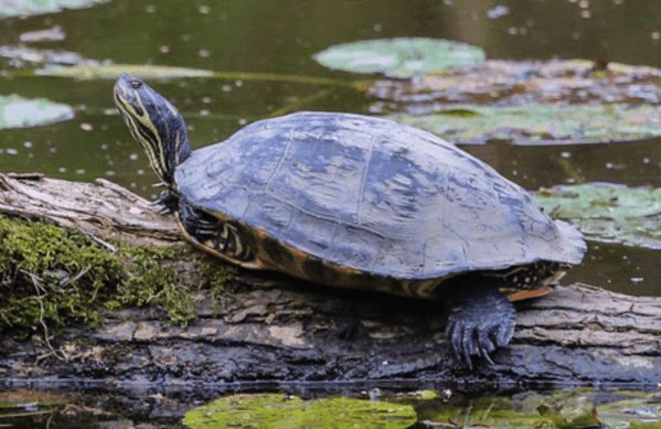 Es ist doch ein seltener Anblick hier am Regenufer bei Chamerau. Das kleine grüne Tierchen mit dem harten Panzer ist eine Schildkröte. Keine Europäische Sumpf-Schildkröte, wie sie zumindest früher an der Donau und an der Isar vorgekommen ist. Es ist eine Gelbbauch-Schmuckschildkröte aus Nordamerika. Wohl ein ausgewachsenes Weibchen mit 30 Zentimetern Länge. Sie ist seit Sommerbeginn in einem Regen-Altarm bei Chamerau daheim und genießt gerne mal ein Sonnenbad auf einem Baumstamm. Gerne auch in Gesellschaft von Hausgänsen eines nahen Bauernhofs. Wie kommt die kleine Schildi aus Nordamerika zu uns in die Oberpfalz? Geschwommen ist sie sicher nicht. Sehr wahrscheinlich ist, dass sie jemand ausgesetzt hat, weil der Platz im heimischen Aquarium zu knapp war. Diese Gelbbauchschildkröten gibt es in Zoohandlungen zu kaufen.