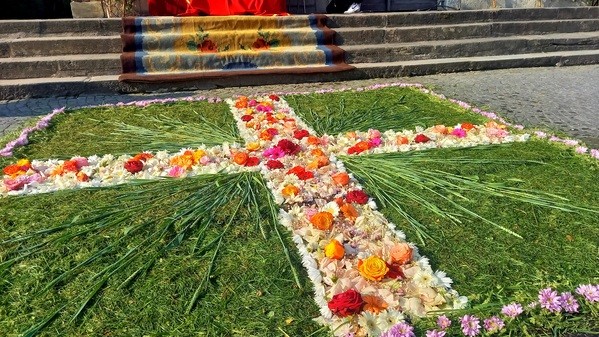Info zum Bild: Ein Blumenteppich schmückt den Bereich vor dem Altar am Emmeramsplatz in Regensburg.