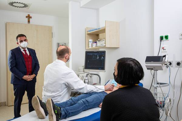 Bild zeigt Gesundheitsminister Klaus Holetschek im Gespräch mit einem 12-jährigen Patienten, seiner Mutter und dem behandelnden Arzt Dr. Stephan Gerling bei der kardiologischen Untersuchung in der Klinik St. Hedwig. Der Patient erkrankte vor 1 Jahr an COVID-19 und leidet nun auch an dem Post-COVID-Syndrom. Dies äußert sich in schweren Konzentrationsstörungen.