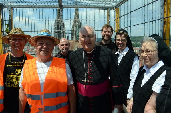 Auf dem Stand der IG Historische Straßenbahn Regensburg fuhren die stellvertretenden Oberbürgermeister der Partnerstadt Pilsen Pavel Bosak und Lucie Kantorova, eine Delegation aus der Partnerstadt Brixen sowie Bischof Voderholzer zusammen mit dem Domkapitel in der SCHMIDBAUER-Kran-Gondel hoch in die Lüfte.