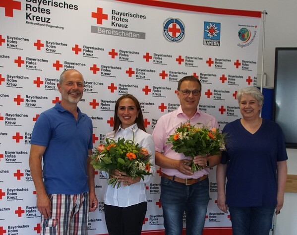 Bildunterschrift: Stellvertretend für die Helfer*innen des BRK Ceylan Mermerkaya und Stefan Deml (BRK Servicestelle Ehrenamt) mit den Vertretern des BDS Thomas Wein und Dr.med. Ilka M. Enger