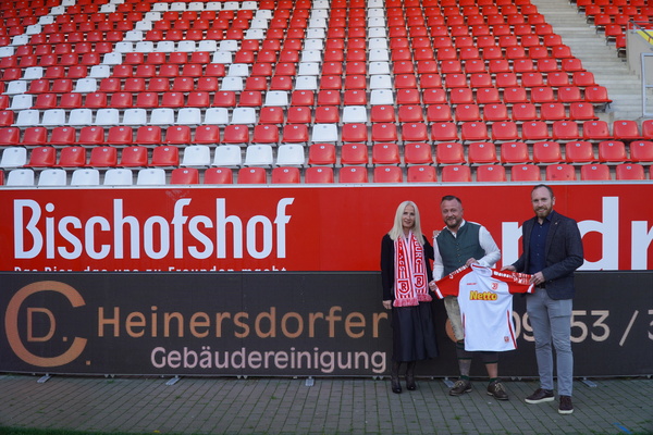 von links nach rechts: Doris Weigl (C.D. Heinersdorfer Gebäudereinigung), Christopher Heinersdorfer (Inhaber der C.D. Heinersdorfer Gebäudereinigung) und Alexander Hahn (Leiter Organisation & Infrastruktur des SSV Jahn)