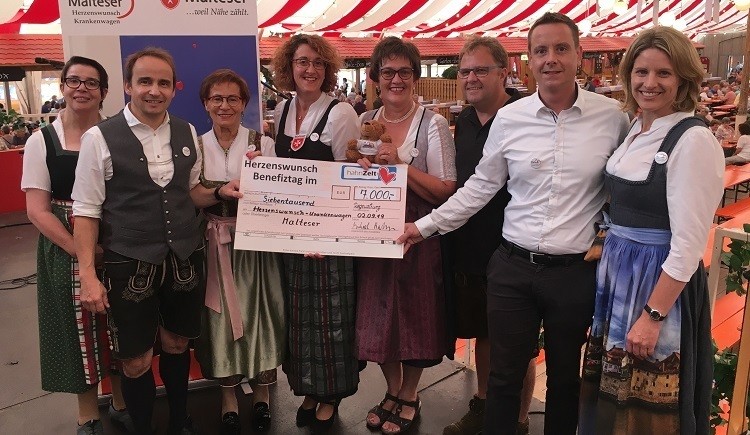 Die Malteser in Ostbayern erfüllen letzte Wünsche von todkranken Menschen und fahren sie zu ihrem Wunschort. Die Erfüllung eines Herzenswunsches bedeutet noch einmal für ein paar Stunden aus dem Krankenhaus oder dem Hospitz zu kommen und etwas persönlich Wichtiges zu erleben. Sei es der Abschied von der geliebten Ehefrau, die im Altenheim lebt oder ein Besuch im Zirkus, eines Fußballspiels oder an der Teilnahme an der Hochzeit der Enkelin. Bis jetzt wurden diese Fahrten mit einem ganz normalen Krankenwagen durchgeführt. Vor allem für längere Fahrten wird ein Fahrzeug benötigt, das optimal für den Gast ausgestattet ist. Ein fahrbares und medizinisch gut ausgestattetes Wohnzimmer sozusagen. Dieser Herzenswunsch-Krankenwagen wird rund 100.000 Euro kosten. Deshalb gab es am Samstag im Hahnzelt auf der Regensburger Herbstdult einen „Herzenswunsch Benefiztag“. Mit einem Programm für die ganze Familie. Unterstützung fanden die Malteser dabei bei der Festwirtsfamilie Hahn, die 50 Prozent des Zelt-Umsatzes bis 16 Uhr gespendet hat. Heute übergab Festwirt Michael Hahn einen Scheck an die Malteser – 7.000 Euro kamen zusammen. Zusätzlich spendeten die Bedienungen des Hahnzelts noch 365 Euro.