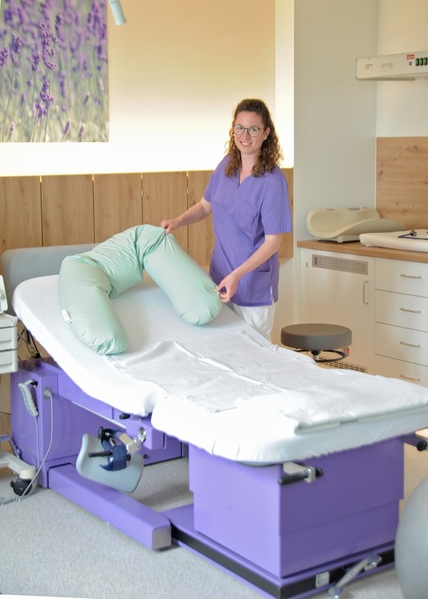 Bild: Der Kreißsaal des Schwandorfer Krankenhauses bietet drei unterschiedliche Zimmer mit angenehmer Atmosphäre, hier zeigt Hebamme Ann-Kathrin Frömming ein Gebärbett.