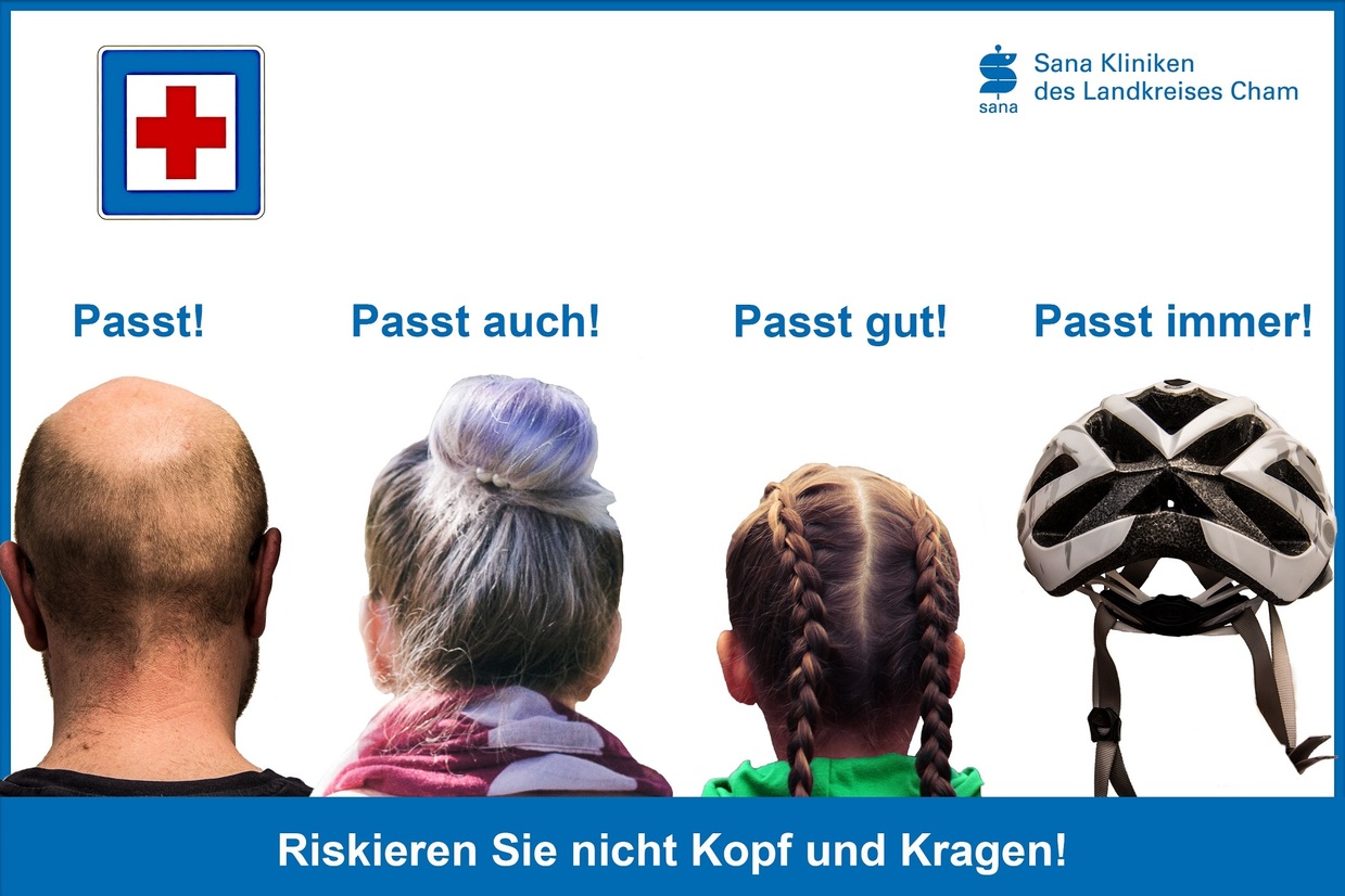 Die Sana-Kliniken im Landkreis Cham wollen jetzt dagegen steuern und starten eine „Gesundheitsaktion“ unter dem Motto „Riskieren Sie nicht Kopf und Kragen“. Mit Postern und Postkarten wollen die Krankhäuser darauf aufmerksam machen, wie wichtig es ist, einen Helm zu tragen. Beispiele für diese Poster sind unten abgebildet. Die Poster hängen ab sofort in den Sana Kliniken in Roding, Cham und Bad Kötzting, außerdem im Landratsamt und bei Fahrradhändlern im Landkreis Cham.