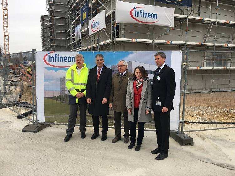 (Bild 2: Infineon Fertigungsleiter Lutz Labs (r.), die beiden Regensburger Bürgermeister Gertrud Maltz-Schwarzfischer und Jürgen Huber sowie weitere Infineon-Mitarbeiter beim Spatenstich)