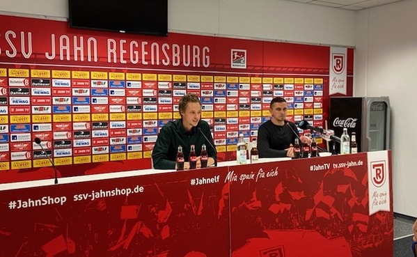 (Bild: Jahn-Pressesprecher Johannes Liedl (li.) und Jahn-Trainer Mersad Selimbegovic bei der Pressekonferenz)