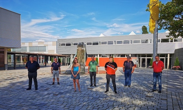 (Bild: Zum Start des digitalen Zeltlagers haben sich Kreisbrandrat Robert Heinfling, Kreisjugendwart Christoph Spörl sowie dessen Stellvertreter und die beiden Jugendsprecher des Landkreises zusammen gefunden um den offiziellen Start für das digitale Zeltlagers.)