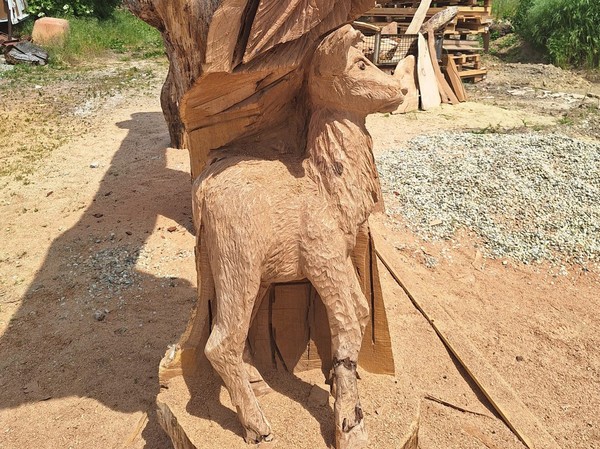 Etwa fünf Stunden lang werden die beiden Kettensägenschnitzer am Sonntag vor Publikum im Hof des Schosshotels an der Holzskulptur arbeiten. Bis dahin stecken aber schon rund 40 Stunden Arbeit darin, verrät „Der Stihlschnitzer“. Auf dem Hof der Familie Beitelhauser (MCB Motorgeräte) in Ergoldsbach laufen in diesen Tagen bereits die Vorarbeiten (siehe Fotos).