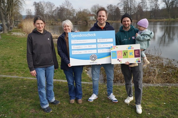 Bild: Jasmin Hummel-Frank und Kerstin Weinrich-Sedlacek von der Geschäftsleitung des Frauenhauses im Landkreis Schwandorf, Tobias Brunner und Sebastian Bernhard mit Töchterchen Emilia bei der Spendenübergabe.