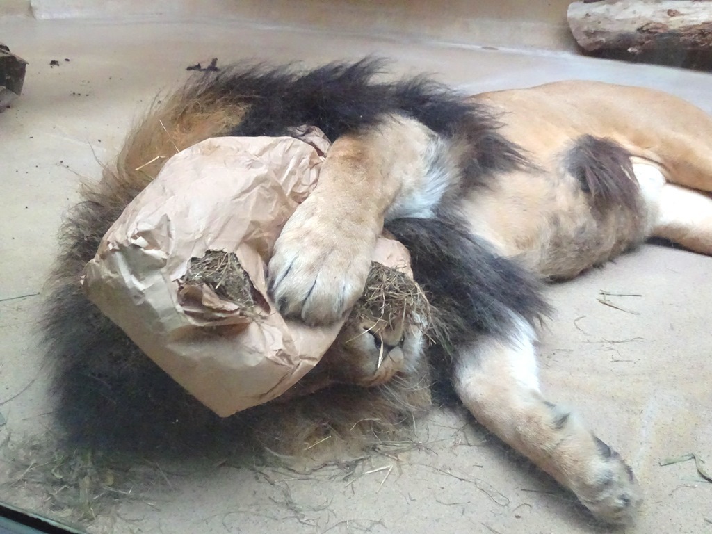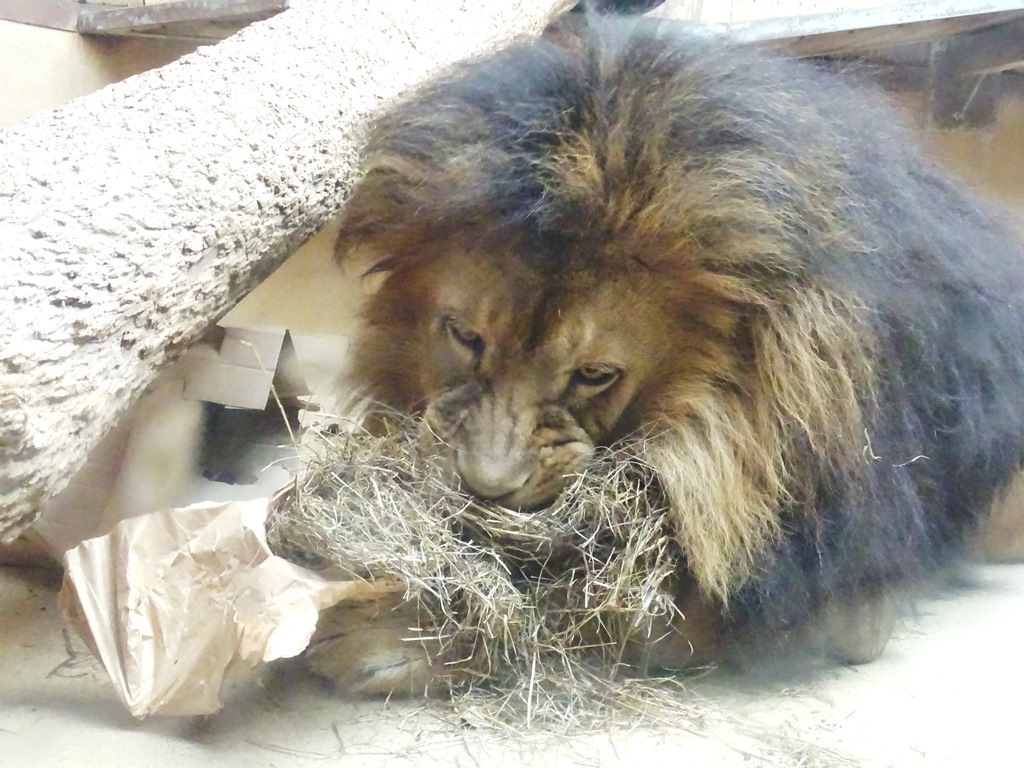 Wer freut sich jetzt Ende Januar noch über Weihnachtsbäume? Die Löwen im Tiergarten Straubing. Den Afrikanischen Löwen wächst naturgemäß kein Winterfell, so dass sie nur in die Außenanlage gelassen werden, solange die Pfleger die Innengehege reinigen. Dass er dann auch gerne wieder ins Warme möchte, zeigt Kiano jedes Mal deutlich mit ungeduldigem Maunzen. Um den Löwen den Tag im Innengehege zu versüßen, denken sich die Tierpfleger immer wieder kleine Beschäftigungen aus. Mal sind es alte, ausgediente Fußbälle, die aufmerksame Tiergartenbesucher abgegeben haben, mal ist es eine Tüte Silage, mal eine Kiste mit duftenden Gewürzpflanzen, mal ein bisschen Winterwolle vom Yak oder vom Wisent. Manchmal ist in einer Kiste sogar ein Ei oder ein kleines Stückchen Fleisch versteckt. Aber auch duftende Tannenbäumchen werden von den Löwen gerne angenommen und in alle Einzelteile zerlegt. Diese erhält der Tiergarten meist von Christbaumverkäufern, die damit ihre übrig gebliebene Ware einem guten Zweck spenden. Dabei legt der Tiergarten allerdings großen Wert darauf, dass kein Schmuck mehr dran hängt und dass sie ungespritzt sind.