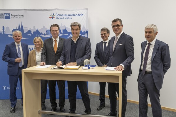Foto: Ministerpräsident Dr. Markus Söder (Mitte) trug sich in das Goldene Buch der IHK Regensburg ein. Mit ihm diskutierten bei der IHK-Vollversammlung (v. l.) die IHK-Vizepräsidenten Thomas Hanauer, Rita Högl, IHK-Hauptgeschäftsführer Dr. Jürgen Helmes sowie (v. r.) IHK-Vizepräsident Dr. Rolf Pfeiffer, IHK-Präsident Michael Matt sowie IHK-Vizepräsident Dr. Alois Plößl.