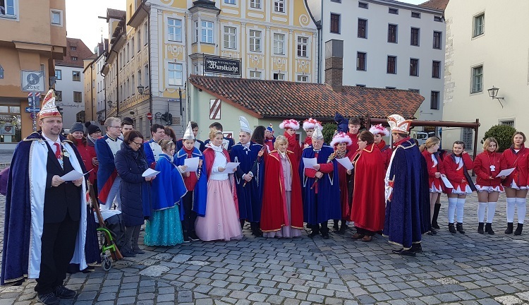 Kalt, aber sonnig war`s an der Regensburger Wurstkuchl, um Punkt 11:11 Uhr hat die Faschingsgesellschaft Narragonia die närrische Zeit beendet – mit dem Geldbeutelwaschen. Das hat in Regensburg eine jahrelange Tradition: