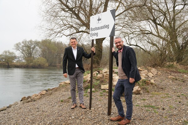 Foto: Florian Best, Geschäftsführer des Tourismusverbandes im Landkreis Kelheim e.V., (rechts) und Bürgermeister Thomas Memmel, Neustadt, (links) am neu beschilderten Bootsausstieg in Eining.