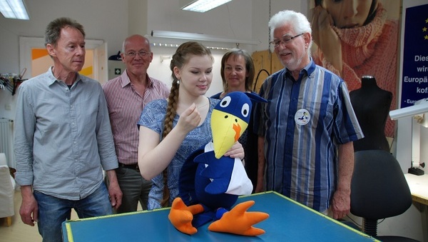 Die Leiterin der Schneiderwerkstatt, Meisterin Martina Bauer, meinte zwar, das sei für die Jugendwerkstatt ein gewagtes Experiment, sagte aber trotzdem spontan zu – und das Ergebnis spricht für sich. Aber zuerst wurden Schnittvorlagen erstellt, vergrößert, ausgeschnitten, nochmals vergrößert, genäht und schließlich ausgestopft. Und jetzt hat KUNO seinen blauen Raben im Großformat.