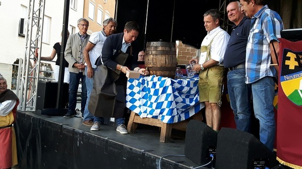 Mit zwei Schlägen hat Oberbürgermeister Thomas Thumann das erste Fass Bier auf dem Altstadtfest angezapft. Gefeiert wird bis Sonntag spät in die Nacht. 50 Musikgruppen spielen bis zum Sonntag auf fünf Bühnen.