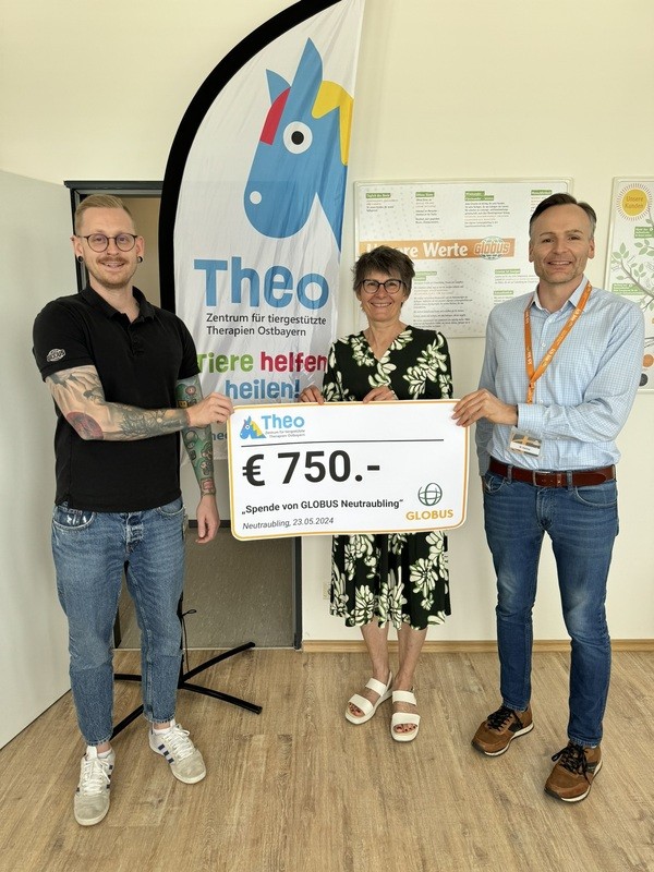 Die Menschen in Stadt und Landkreis Regensburg helfen und halten zusammen – das beweist das große Spenden-Projekt THEO vom vkm Regensburg, dem Verein für Körper- und Mehrfach-Behinderte. Für das vom Verein geplante Zentrum für tiergestützte Therapien in Zeitlarn ist jetzt wieder eine Spende eingetrudelt – von Mitarbeitern vom Globus in Neutraubling. Sie haben den Erlös einer internen Schnäppchen-Versteigerung für THEO gespendet, mehrere hundert Euro, ein weiterer Baustein für das Therapie-Zentrum, das ab dem Herbst gebaut werden soll.