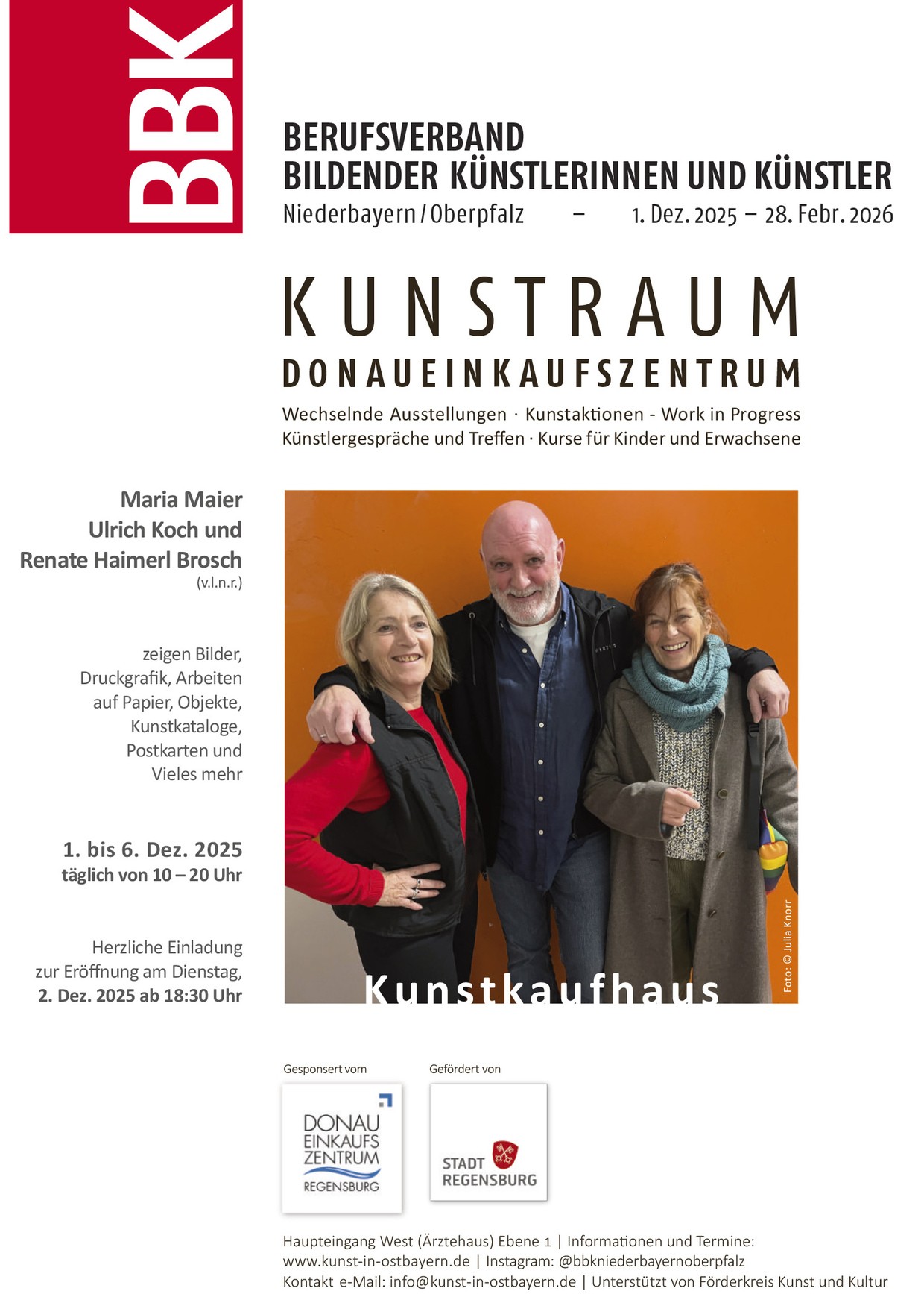 Hier im Regensburger Donau-Einkaufszentrum kriegt ihr nicht nur Weihnachtsgeschenke, sondern auch Kunst und Kultur. Hier wird heute Abend offiziell die offene Kunstplattform eröffnet. Über 40 Künstlerinnen und Künstler präsentieren ein vielfältiges Programm aus Atelier, Ausstellung und Aktion . Bis Ende Februar 2026 zeigen die Mitglieder des Berufsverbands Bildender Künstlerinnen und Künstler Niederbayern/Oberpfalz abwechselnd ihre Werke. Den Auftakt machen vom 1. bis 6. Dezember 2025 die Künstler:innen Maria Maier (Zeichnung, Grafik, Malerei), Ulrich Koch (Zeichnung, Grafik) und Renate Haimerl Brosch (Objekte, Grafiken). Das Projekt versteht sich als lebendiger Kunstort auf Zeit – offen für Diskurs, Begegnungen, Austausch, Augenschmaus und Kaufmöglichkeit mitten in der Einkaufsmeile.