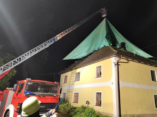 Bild zeigt Sicherung eines teilweise abgedeckten Dachs durch die Feuerwehr in Döfering im Landkreis Cham.