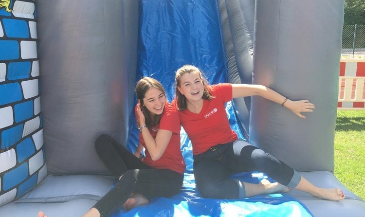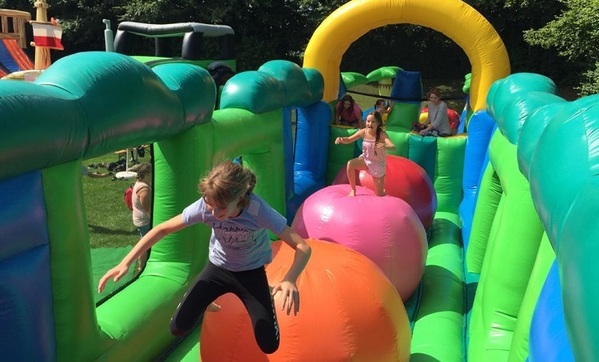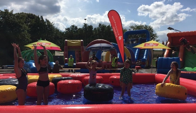 Auf dem Sportplatz, steht auf einer Länge von über 150 Metern ein aufblasbarer Freizeitpark.Knallbunt, mit Wasser oder Kletterelementen. Auch ein Karrusell aus Luft ist mit dabei – Hier bleibt kein Wunsch offen, Kinder können sich hier austoben bis sie abends ins Bett fallen. Aber nicht nur die Kleinen dürfen spingen, auch für die Eltern ist jede Menge Aktion geboten.