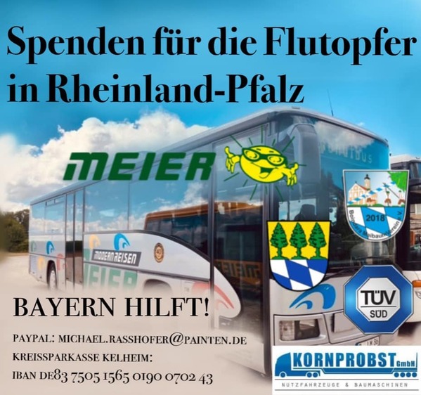 Der „Boindara Maibaumverein“ aus Painten im Landkreis Kelheim startet die Spendenaktion „Bayern hilft“. Schon vor Monaten waren Vereinsmitglieder mit den Feuerwehren aus Niederbayern und der Oberpfalz im Katastrophengebiet im Einsatz. Seitdem ist der Kontakt zu den Flutopfern nicht abgerissen. Da bis jetzt wenig Geld bei den Betroffenen angekommen ist, will der „Boindara Maibaumverein“ mit dieser Spendenaktion helfen. Das Geld kommt eins zu eins dort an, wo es am dringendsten gebraucht wird.